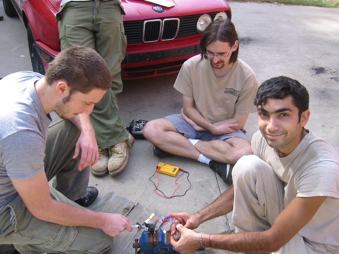 It was mostly uneventful to outfit that thing with a gas motor and throw it at the field. The first 3 flights were exciting (and nearly identical). It rolled to the left...hard, so it followed an arc up, then smashed exactly nose-first into the ground. No damage, luckily. It was kind of distressing when we discovered we'd just hooked the rudder control up backwards, so when the pilot tried to correct for the roll, he just made it worse.