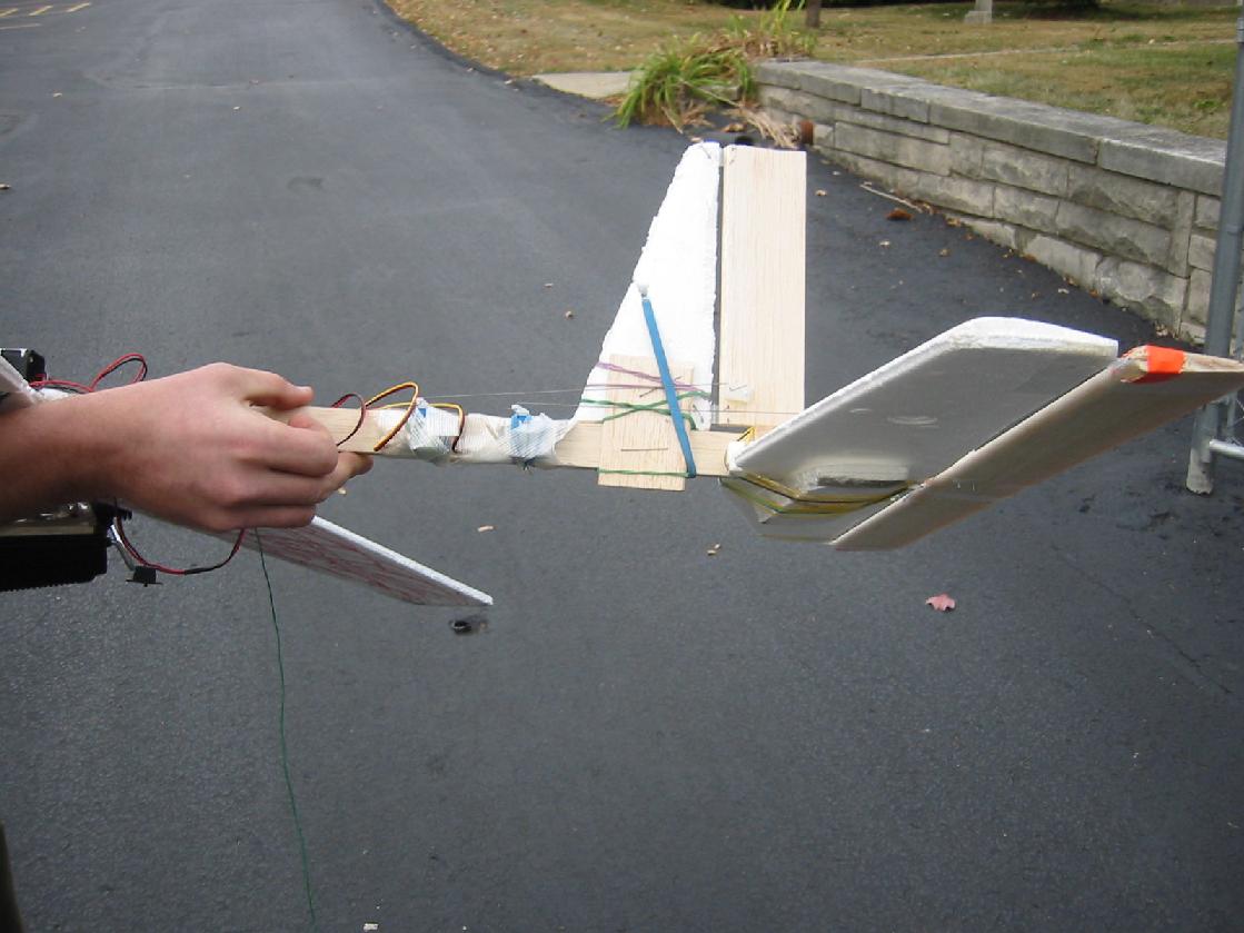 But we were undaunted and used rubberband hacks to kind of hold it together. It was a joke in flight, whenever it would jolt at all, the rubber bands would let the stick with the battery on it swing far off to the side. But eventually we just didn't care and Zack tried a frisbee launch that was actually a lot of fun...I could detect that we had control. Not enough to do anything with, at least not with my reflexes, but it was neat to think of it as just kind of a variable aerodynamic object even though it was operating well outside of conventional straight-line flight.