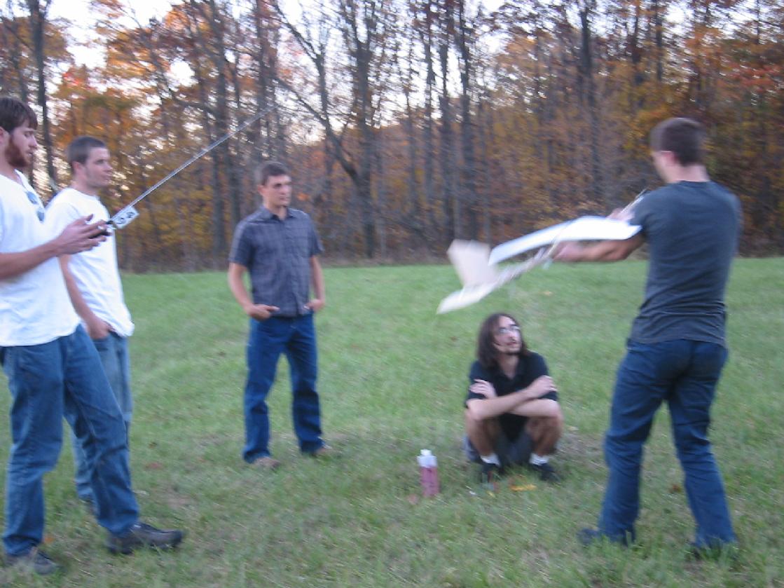 Zack taped a balsa splint on and the plane had two successful flights after that. It proved to be a very capable plane, very responsive, very overpowered, capable of flying into the mild wind we had, turning aggressively, and doing loops without any difficulty whatsoever. I turned out to be a fairly sketchy pilot, easily confused about which direction the plane was pointing, but it was still one of those magical experiences. Kava proved to be an able climber, but we eventually had to leave the plane in a tree overnight until we figured out how to get it out (32ft fiberglass ladder, 20ft metal pipe).