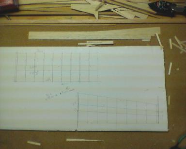At the beginning of December I built a new wing. There are two new features in this wing. It has ailerons. It is built out of balsa ribs. I just drew an "airfoil shape" on my foam board and then traced it onto a piece of balsa with an x-acto, then I cut a bunch with that as a model. I did a very poor job but I knew I would -- the real experiment was to see if you could make a wing using this approach even if you don't cut very carefully (i.e., instead of buying a laser-cut kit).